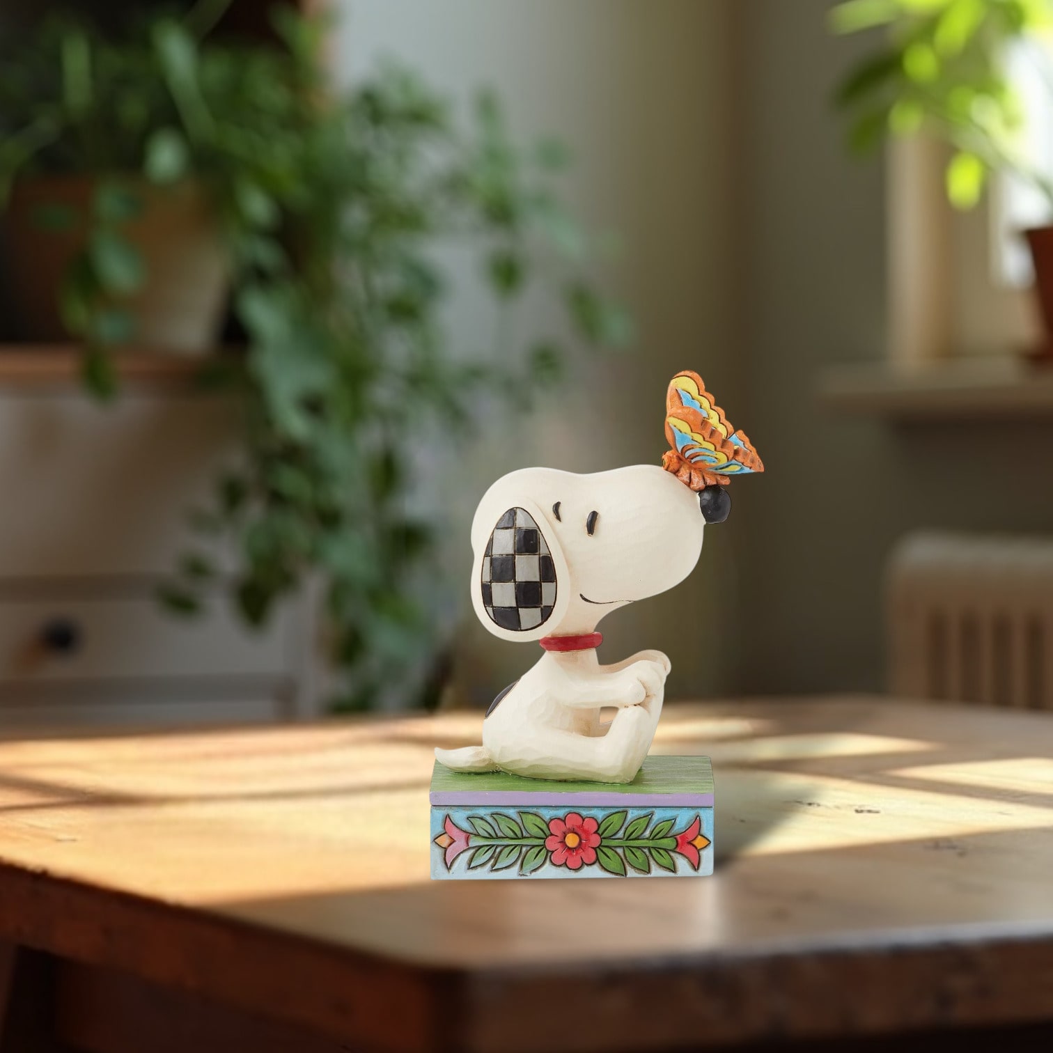 スヌーピーの鼻先に蝶がとまった瞬間を捉えた、愛らしく心温まるデザインのフィギュアです。