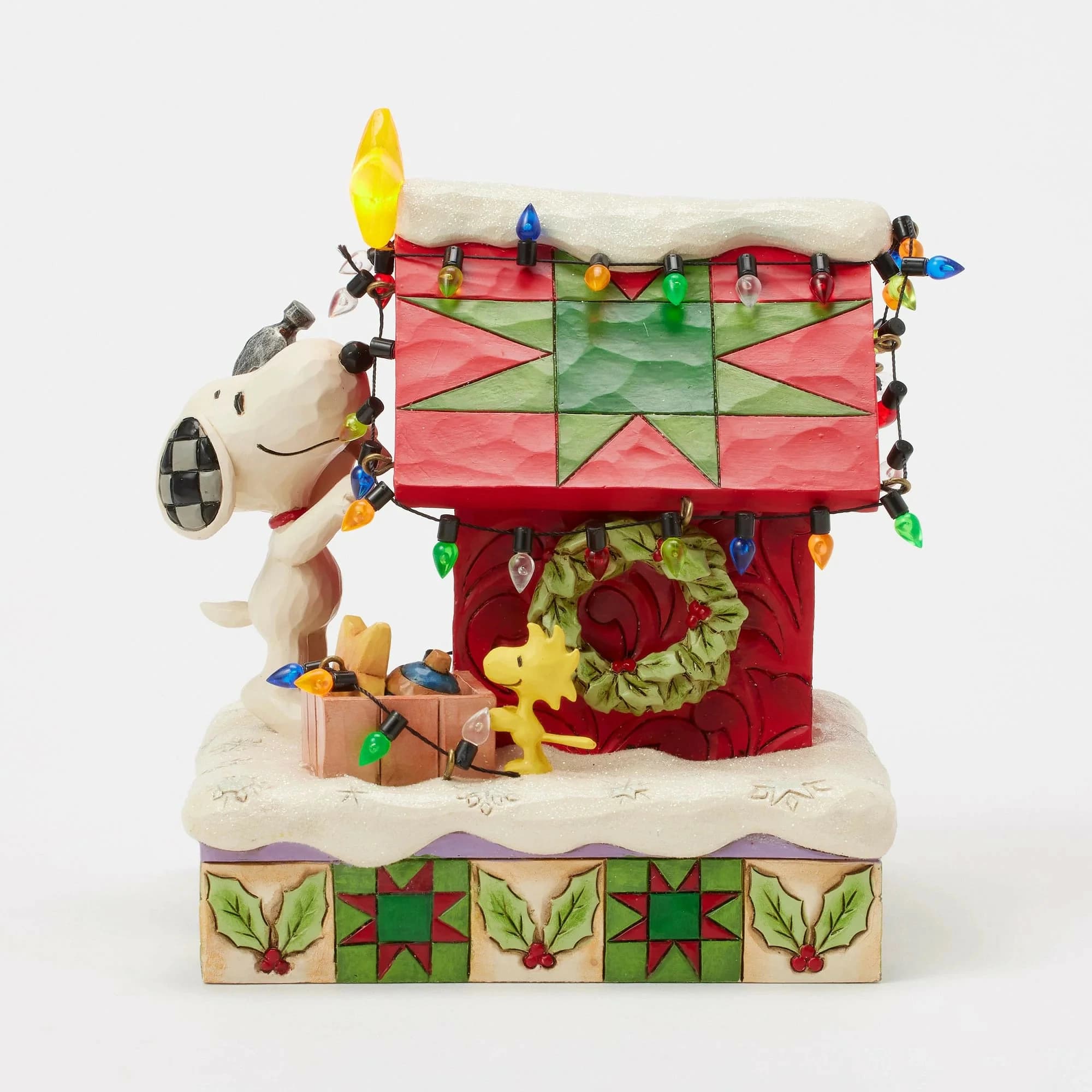 スヌーピーとウッドストックがクリスマスの準備をする、心あたたまるシーンを再現したフィギュア。