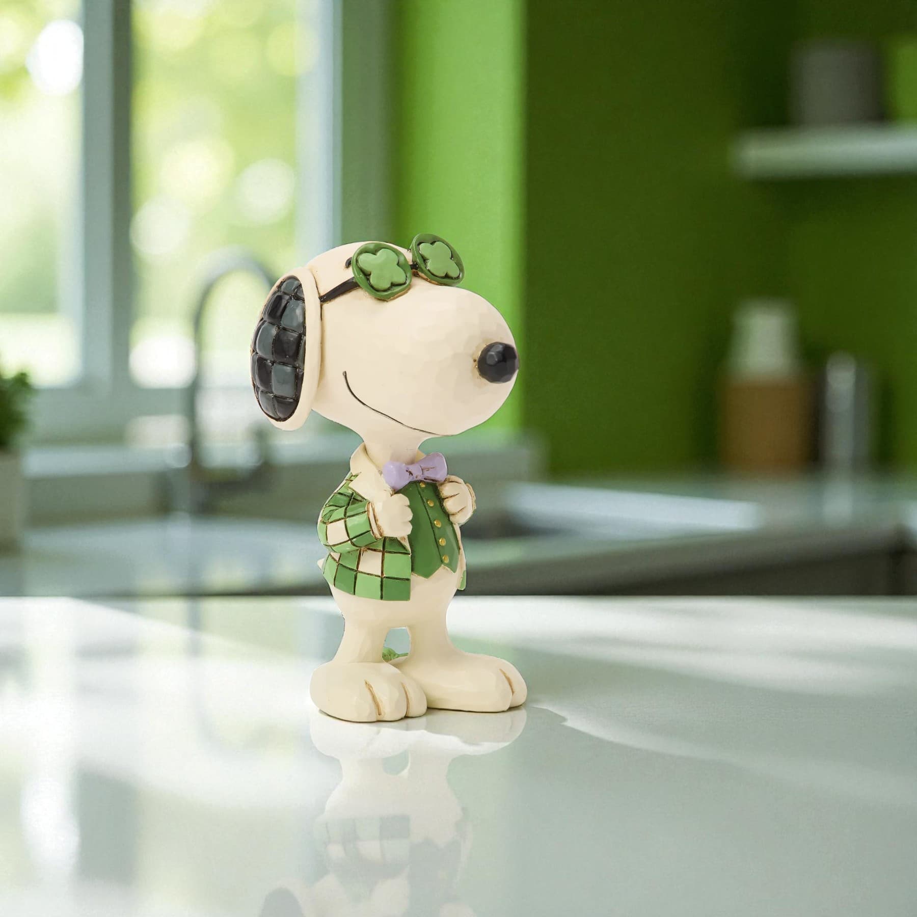 幸運を呼ぶクローバーを身に着けたミニサイズのスヌーピーは、デスクや棚に飾るのにぴったり。