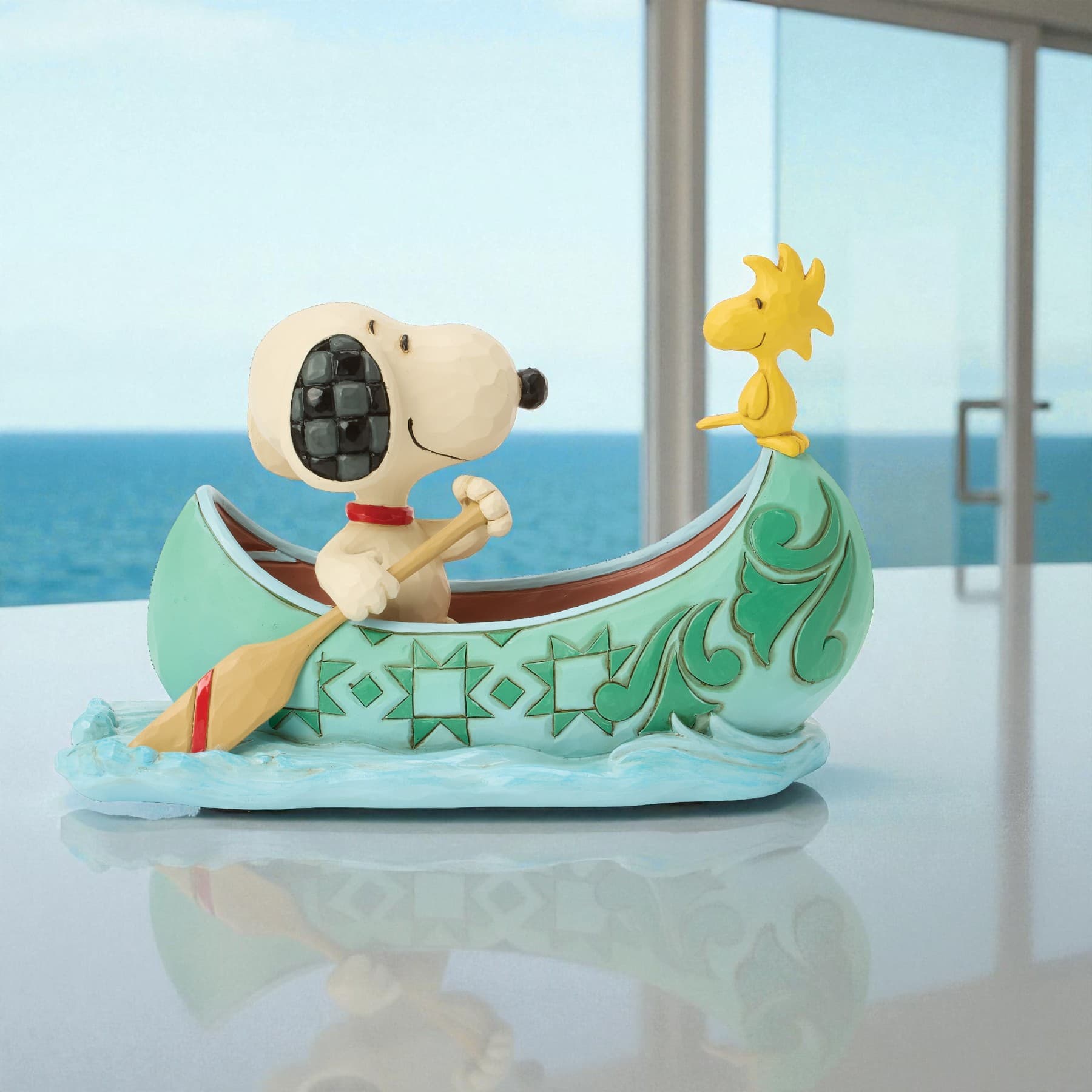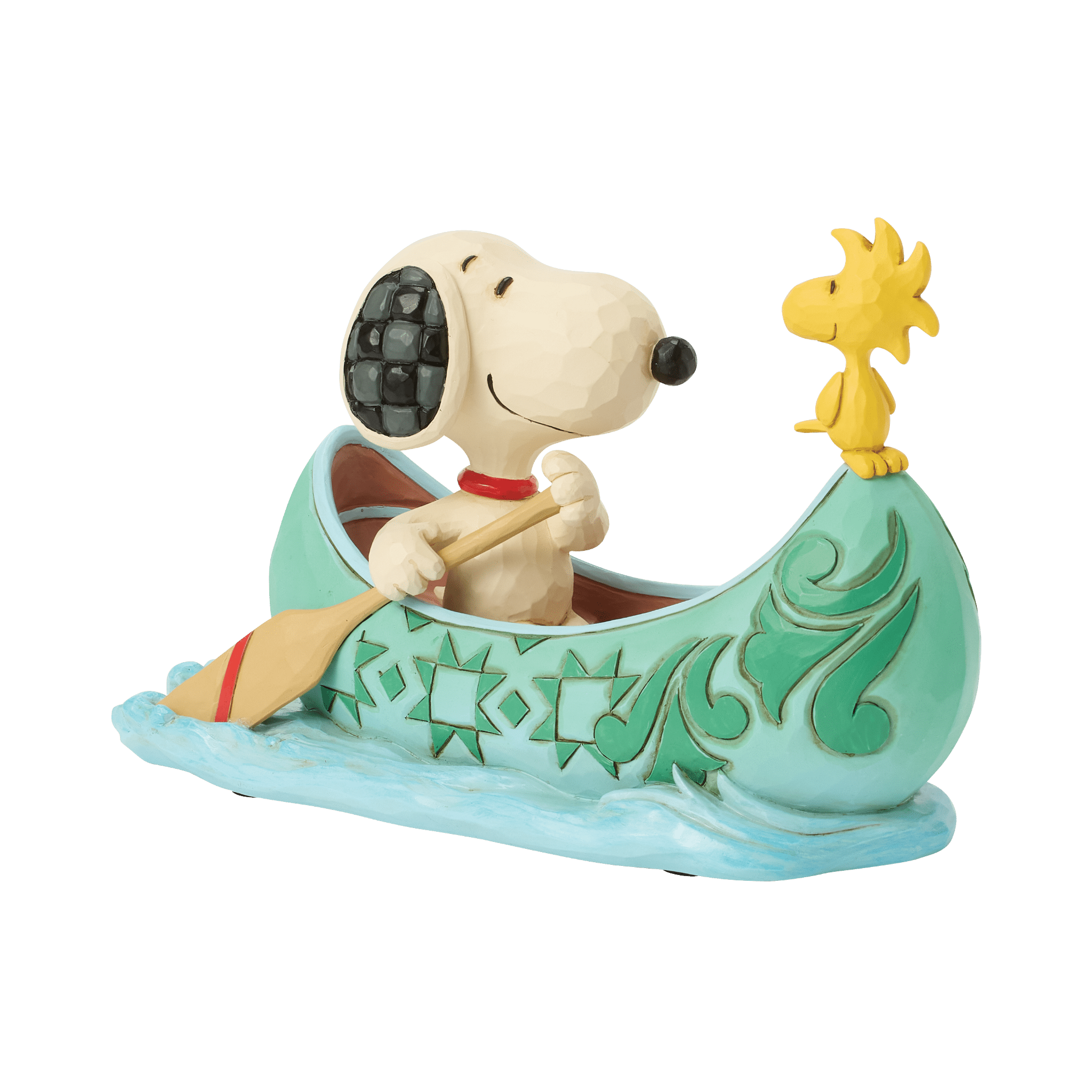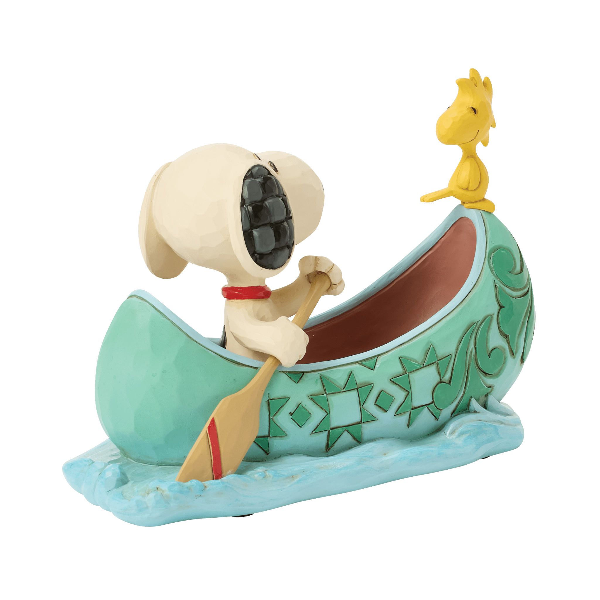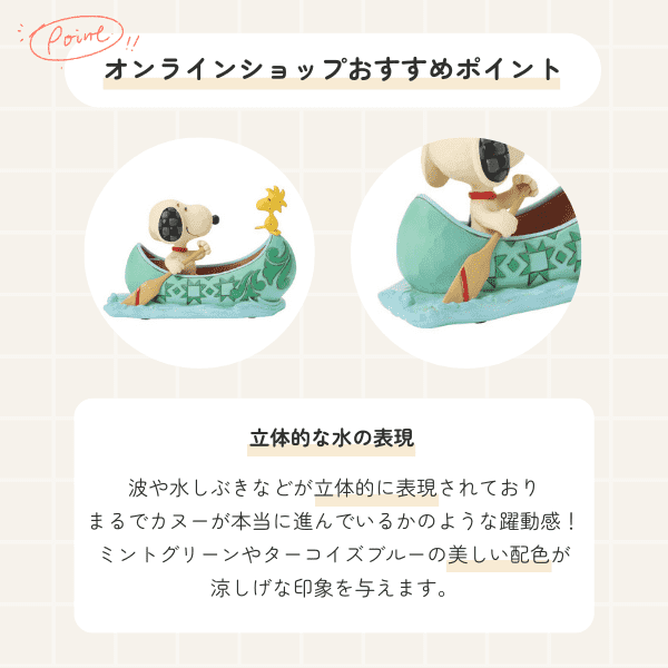 楽しそうな笑顔のスヌーピーがパドルを握り、船尾には親友のウッドストックを乗せて、波を切りながらカヌーを漕ぎ進める様子を表現しています。