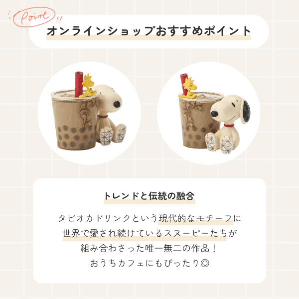 トレンドと伝統が融合したこのフィギュアは、PEANUTSファンだけでなくタピオカ好きの方へのプレゼントや、デスク周りのアクセントにもおすすめです。