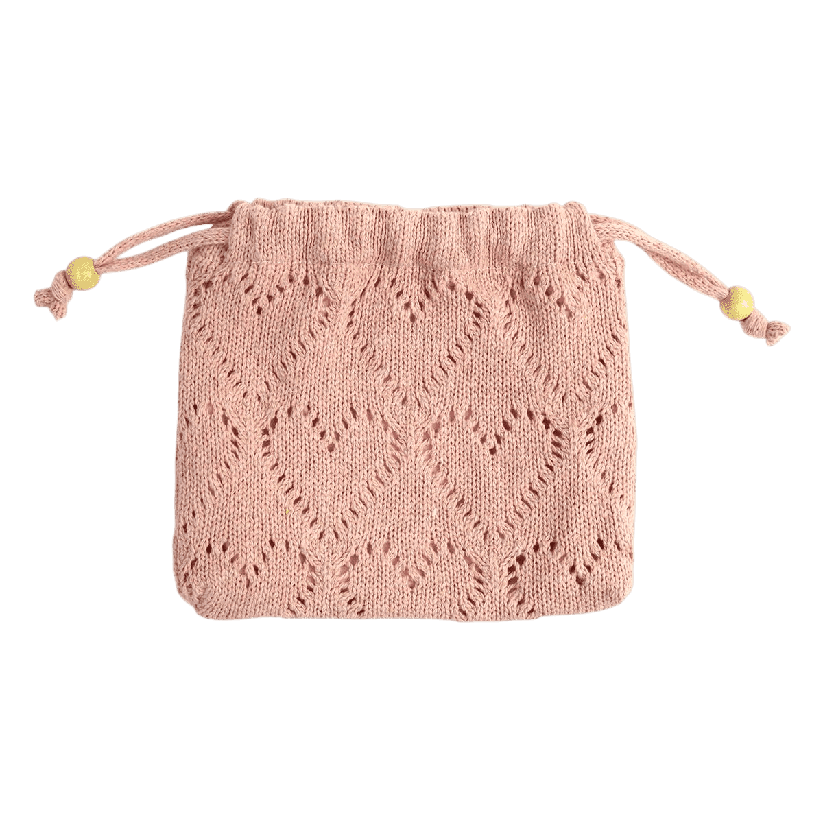 ハートの透かし編みが目を惹く、トレンド感たっぷりのニット巾着ポーチ。