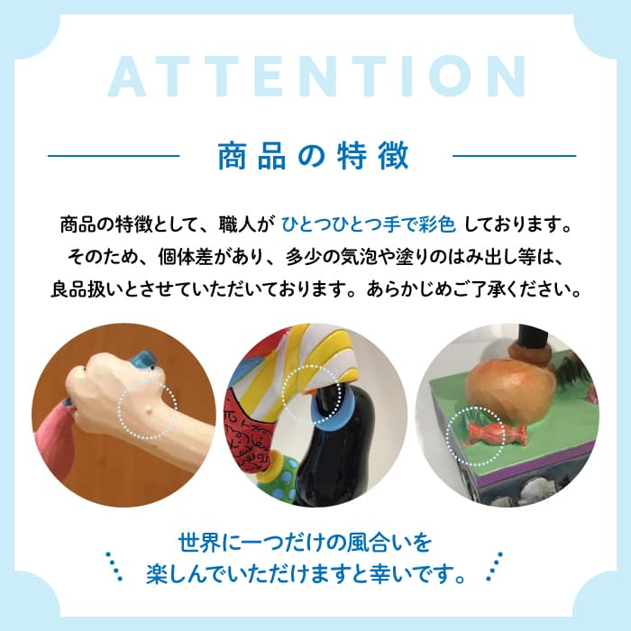アンティーク調の彩色と木彫り風のあたたかみある質感が、インテリアとしても上質な存在感を放ちます。