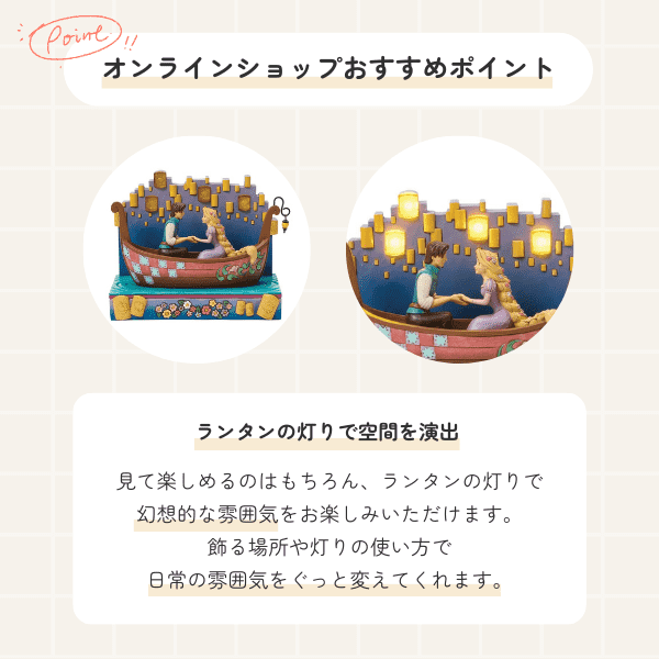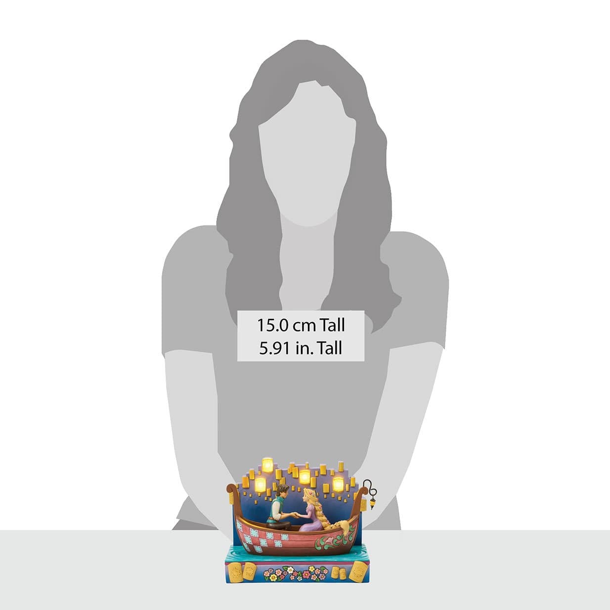 ラプンツェルとフリンが小舟に乗り夜空に無数のランタンが浮かぶ感動的な瞬間を、立体感あふれるフィギュアとして楽しめます。