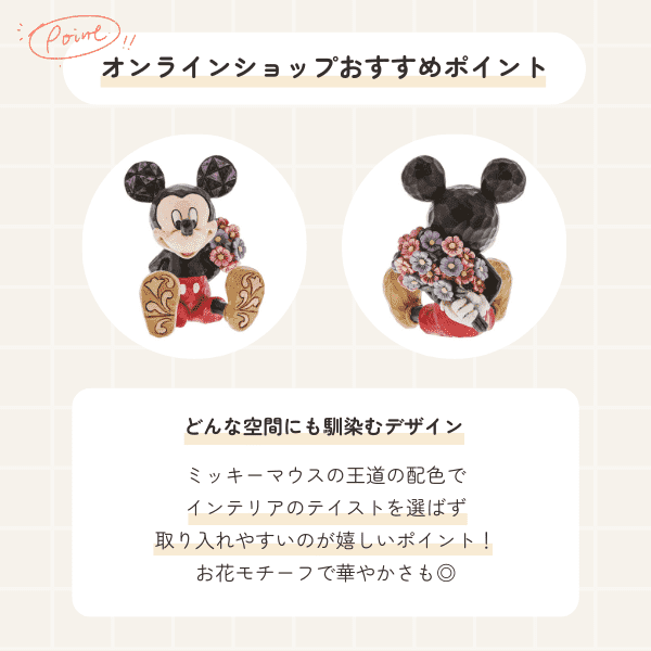 ミッキーたちのフィギュアは、可愛らしいのはもちろんのことお部屋を彩ってくれるインテリアとしてもピッタリです。