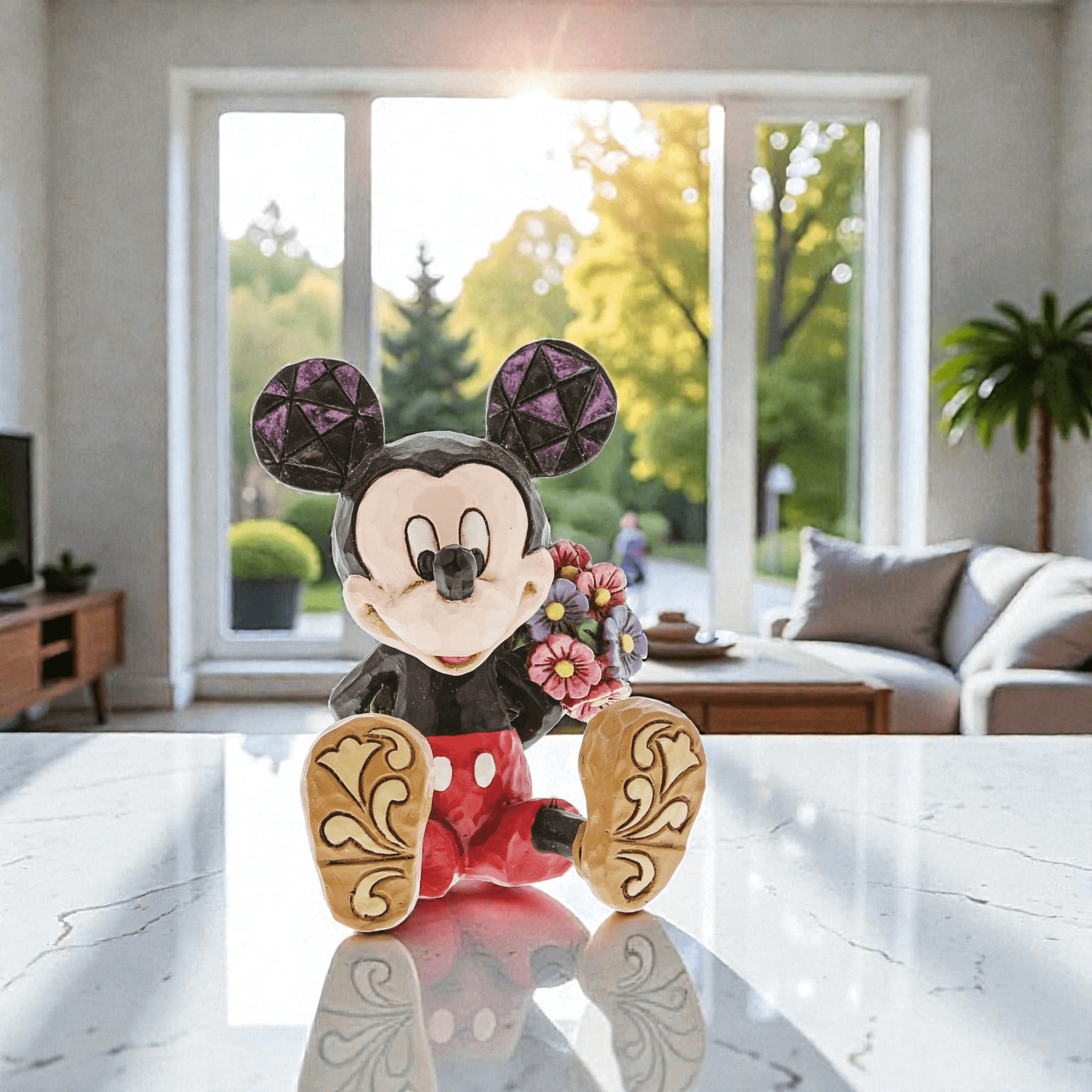 お花を手にしたミッキーの愛らしい姿が印象的で、見る人の心をふっと和ませてくれるデザインです。